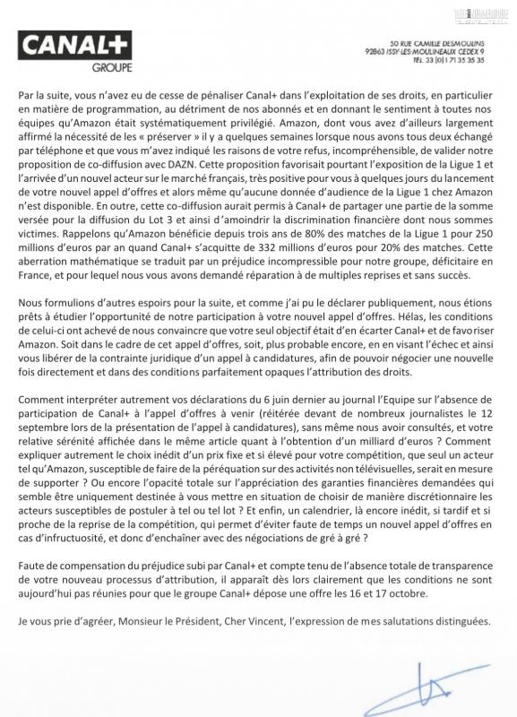 Mais il semble surtout que la LFP préfère vendre ses droits à Amazon qu'à Canal+ si l'on en croit les propos tenus par Maxime Saada dans le courrier envoyé à la LFP et reproduit ci-dessous.