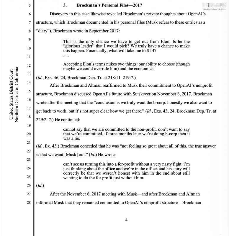 Un journal intime de Greg Brockman datant de 2017 évoque explicitement le désir de « se libérer d'Elon » et de générer des milliards, avec une note suggérant un « mensonge » sur le statut non lucratif. Ces éléments renforcent l'accusation de Musk selon laquelle la transition profitable était planifiée dès le départ.