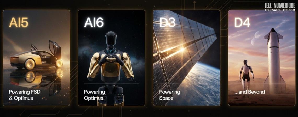 Terafab visera deux types de puces principales. Les premières (Ai5 et Ai6) équiperont les robots humanoïdes Optimus de Tesla et les robotaxis, avec un besoin estimé à 100-200 gigawatts pour des volumes de un à dix milliards d'unités par an. Musk insiste : "La quantité a sa propre qualité." Les secondes, baptisées D3, sont conçues pour l'espace, tolérant des températures élevées pour minimiser la masse des radiateurs.
