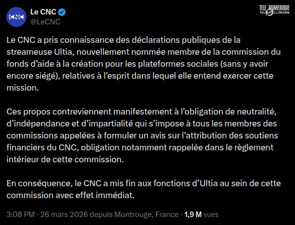 La streameuse Ultia a été brutalement écartée de la commission du CNC après avoir publiquement assumé son intention d'utiliser son poste pour favoriser ses amis et exclure les projets pour des questions idéologiques.