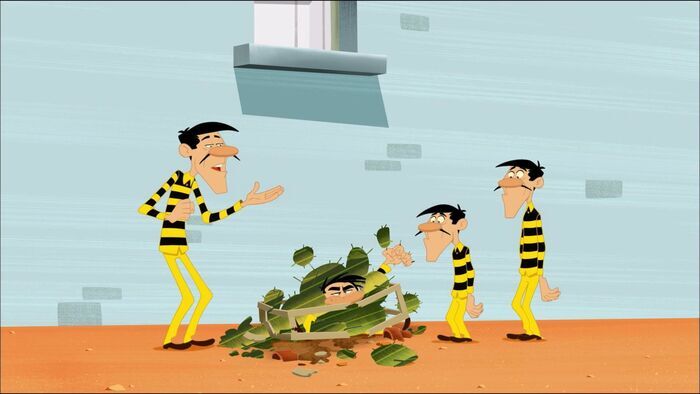 Les Dalton ont décidé de se fabriquer des costumes de cactus. Lors d'une sortie, ils n'auront plus qu'à les enfiler et à se fondre parmi les cactus qui pullulent dehors. Ils rapportent plein de cactus dans leur cellule pour fabriquer leurs costumes. Ça ...
